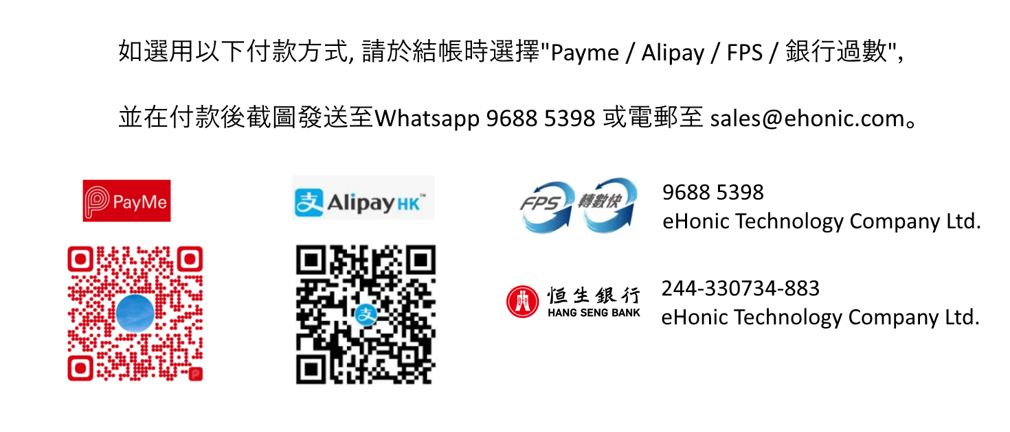 - 付款方式包括: Payme/Alipay/FPS/銀行過數/貨到付款